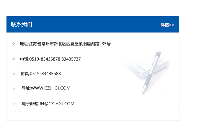 地址:常州市新北區友邦商務大廈1幢16、17層  電話:0519-85101652  傳真:0519-85112595  郵編:213022  網址:www.cz-jiayue_cn.gzdyjt.com  郵箱:xiajifengaa@163.com
